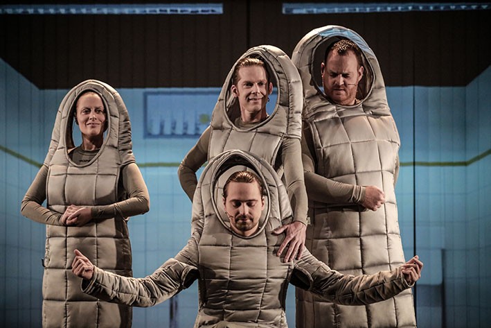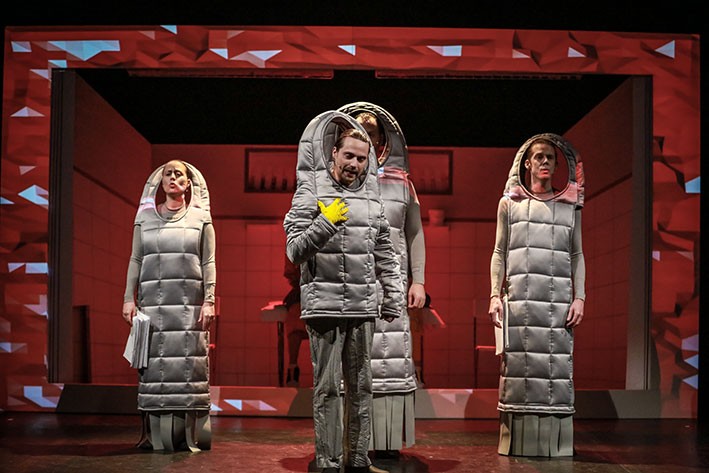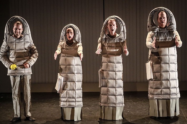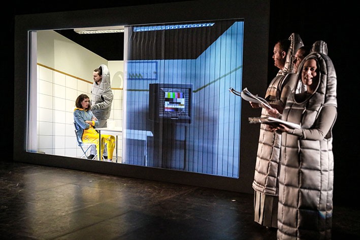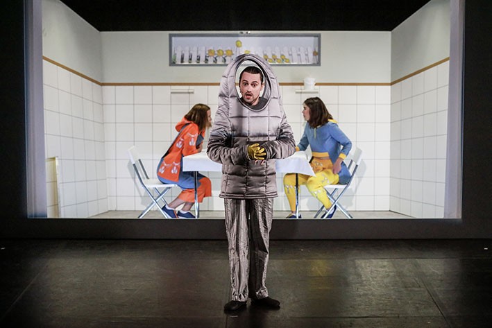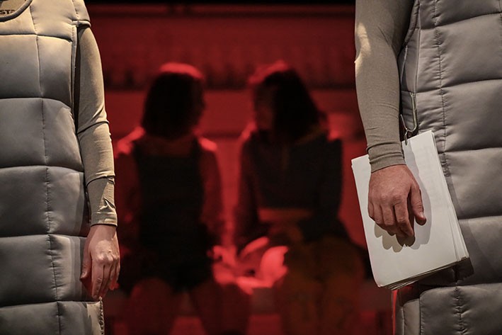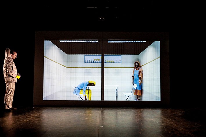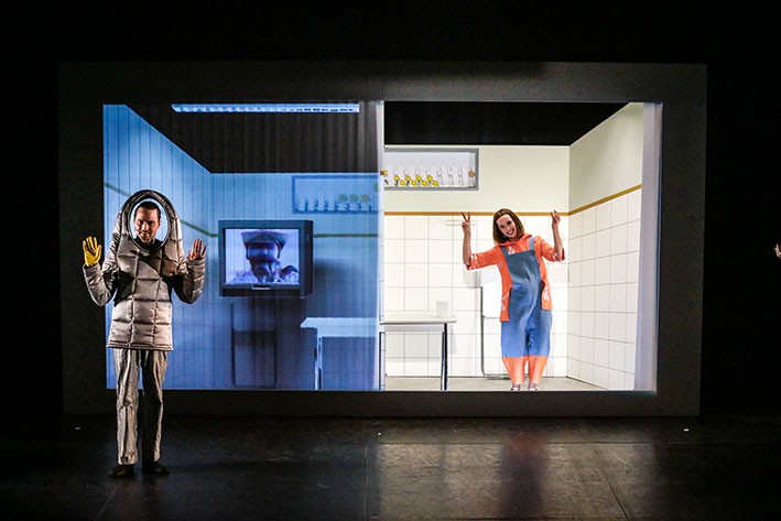Regie Anja Kerschkewicz / Text Svenja Viola Bungarten / Komposition Yuval Halpern / Kostüm Felina Levits / Bühne Antonia Bitter / Video Konrad Kästner / Dramaturgie Alisa Tretau / Es spielen Pauline Jacob, Alexander Merbeth, Anneke Schwabe / Chor Philip Neumann, Viola Bornmann, Eyal EdelmannFotos Vincent Stefan